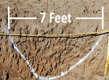 The images below show traditional slip plow ripping in comparison to the Ag Soilworks Vibrosoiler ripper above. As shown below left the bulldozer drives over the ripped row recompacting the ripping line in the process. The center image shows the ripping shape produced by the slip plow which is uneven with only every second 20” being ripped leaving 20” unworked. Within the soil pit analysis we used a penetrometer to determine the quality of ripping and found the bulldozer showed a limited effect in reducing soil compaction with variable results leaving the soil consistency uneven with compacted zones and lumpy boulders throughout the soil profile. There was no blending of broadcast compost and ameliorants into zone.